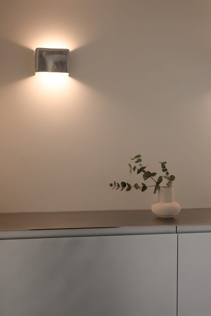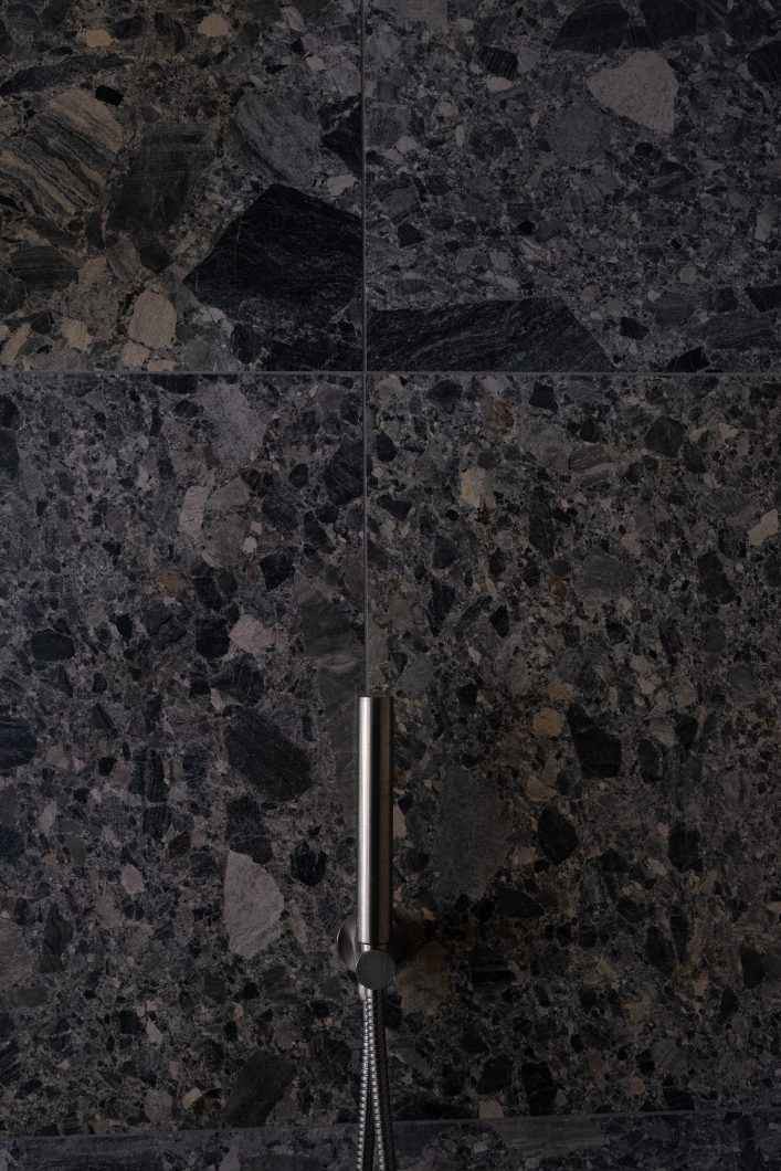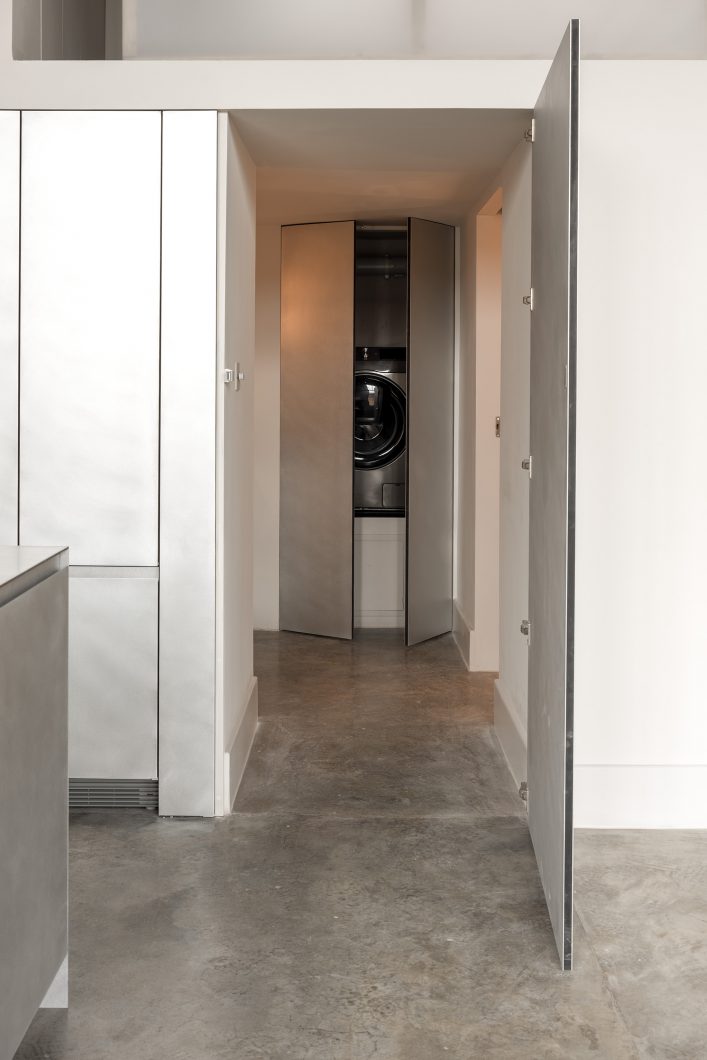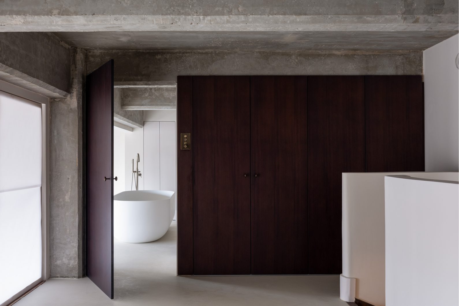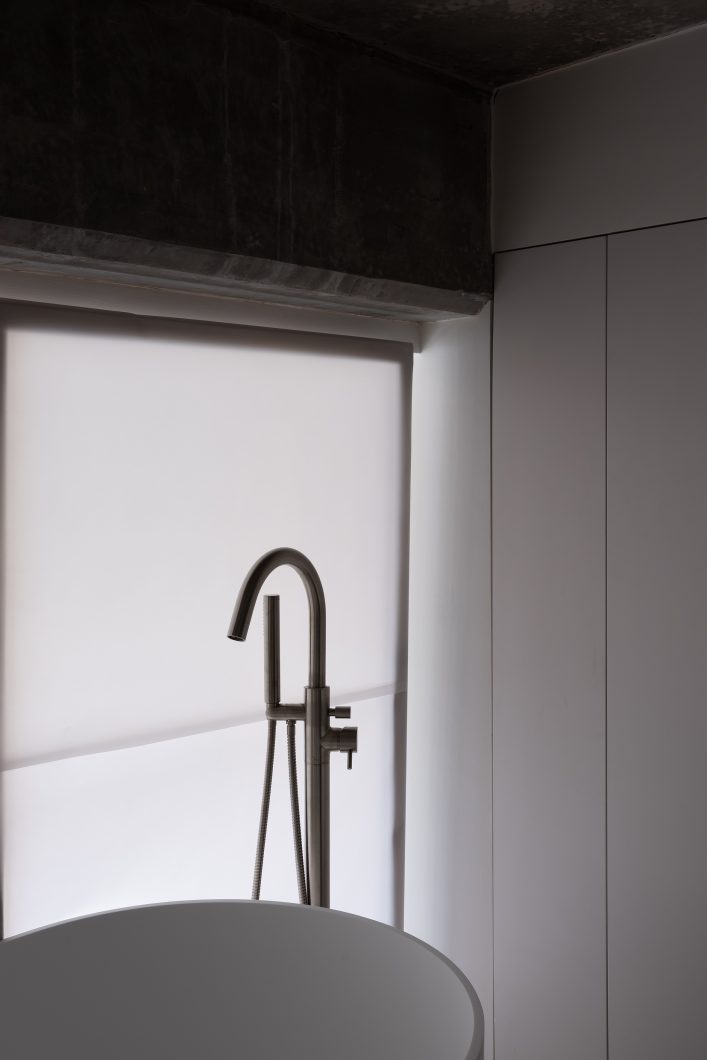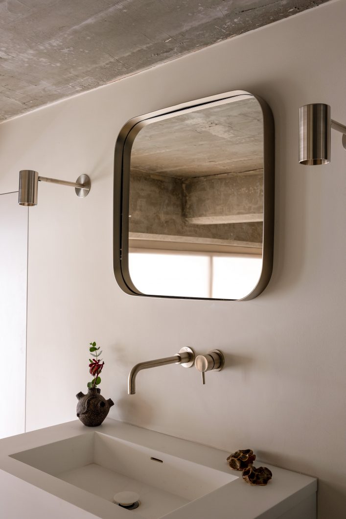 Throughout the apartment, surfaces are pared back and details carefully resolved. The bathroom reveals an honest dialogue between raw structure and precise intervention, where exposed concrete is softened by restrained fixtures and finely finished planes. Elsewhere, built-in elements and cabinetry are shaped not as features, but as quiet supports for daily life measured, functional, and deliberately unobtrusive.