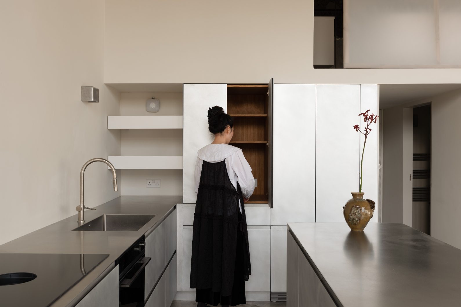 A paired back space for a Victorian townhouse. Using a muted palette, dramatic black window frames, grey Silestone quartz and rich Jacobean oak flooring. Hidden storage and simple shelving maximised the space while exposed brick pillars pointed to the building’s history. The bathroom was meticulously planned to make intelligent use of the limited space.